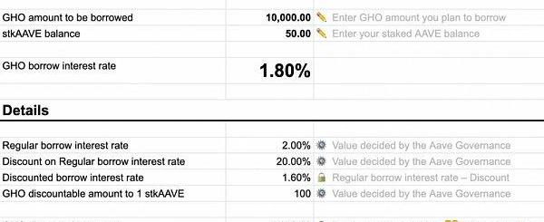 用戶計劃將借款10,000GHO,質押了50sktAAVE,常規借款利率為2%,通用折扣為20%,1sktAAVE可享受100GHO的借款折扣。