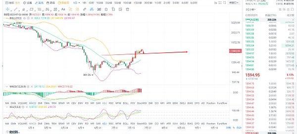 日線級別圖幣價多次突破1600上方沒有在1600上方正式收線企穩,幣價多日在區間震蕩沒有走出方向,目前日線級別圖布林帶是開口狀態,附圖指標KDJ三線運行在100上方進入超買區,短期之內沒有太多利好消息的話幣價是很難突破上方阻力企穩的,根據各項指標和個人盤感來看的話,大家可以在上方阻力布局一波空頭,帶好止損,如果出現突發情況導致幣價一舉突破1600在上方企穩的話,那么我們就空單就得毫不猶豫的止損出局把我多頭方向。