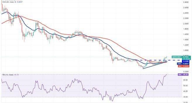 20天均線(15.87美元)已開始回升,RSI已升至接近超買區域,表明多頭占據上風。下行的關鍵水平是18美元。如果多頭將價格維持在該支撐位上方,則ETC/USDT貨幣對可能開始向北進軍至23.50美元,然后是25美元。