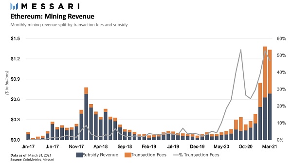 以太坊每天支持大量的經濟活動。它每天結算數十億美元的交易,并且在蓬勃發展的去中心化金融(DeFi)和非同質化代幣(NFT)領域中運行成千上萬的去中心化應用程序(Dapp)。但是,以太坊的區塊空間有限,所有這些應用程序都在爭奪相同的資源,這意味著當網絡擁塞時,交易變得更加昂貴且延遲更多。實際上,對于用戶而言,以太坊上的單筆智能合約交易(例如Uniswap交易)費用可能會超過數百美元,具體取決于網絡的擁塞程度,從而導致交互交易成本過高。但是,這對于受益于如此高的交易費的礦工來說非常好,與2017年的牛市高點相比,礦工收入當前可以增加50%: