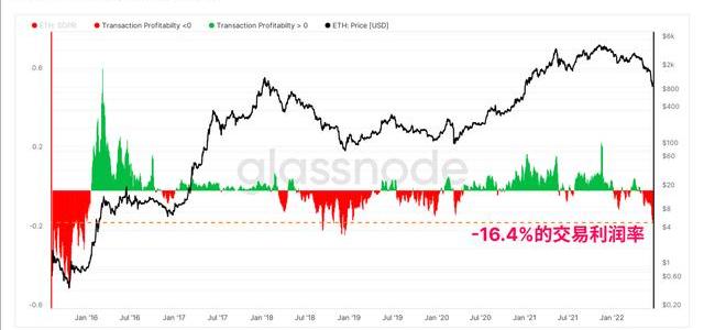 在熊市中,伴隨著下行價格走勢,已實現虧損占了主導地位。在目前的市場上,平均每位交易商在他們賣出的以太坊上實現了-16.4%的損失。這種糟糕的交易盈利能力上一次出現在2018年熊市的深處,當時以太坊的交易價格是84美元。