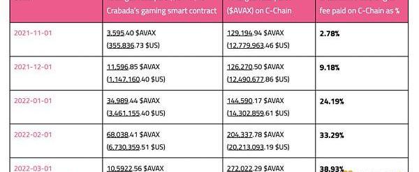從上表中可以看出,Crabada在Avalanche的C鏈上的gas費用份額最高時為38.93%。然而,與許多web3游戲類似,Crabada面臨著主網的網絡擁塞問題,從而促使他們轉向自己的鏈,例如子網。最近,Crabada從AvalancheC鏈轉移到了他們自己的子網SwimmerNetwork。隨著向SwimmerNetwork的遷移,Crabada玩家的gas費降低了85%,交易時間也大大縮短。