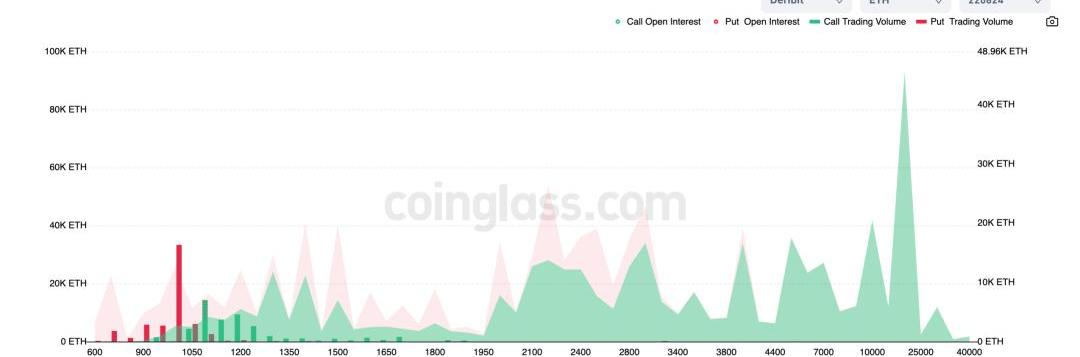 ETH期權在Deribit上的未平倉合約顯示,以太幣的名義價值超過10億美元,等待6月24日到期。有趣的是,根據Coinglass的數據,這些以太幣期權是當前價格水平附近的主要看跌期權,集中在1,000美元附近.