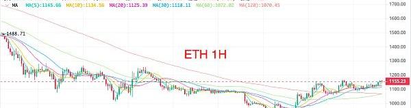如上圖所示,1小時級別看,eth與btc的走勢基本一致,同樣有效突破了該級別的ma120壓力位后,目前處于橫盤筑底階段,震蕩區間在1000-1200之間,失守1000點可以果斷先清倉出掉,上破1200點可以繼續持幣待漲,唯一要做的就是隨著行情的反彈上漲不斷上移止損位即可。