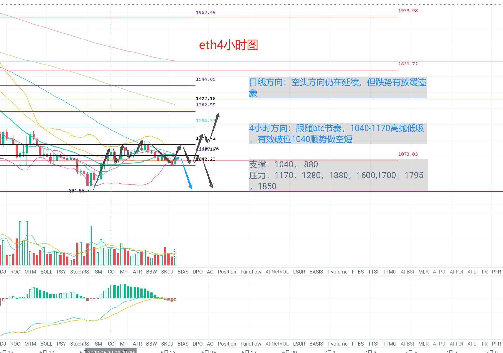 ETH短線支撐980-1040美元,短線壓力1120-1180美元。短線走勢符合冷風回踩的預測,仍然會跟隨大餅波動,向下空間不會太大,建議1000美元附近開始低吸做多。主流幣跟隨大餅波動,按照大餅節奏操作。