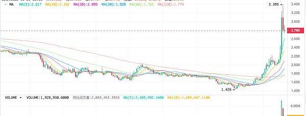 1小時級別看,snx昨晚11點左右的時間點開始有效突破了ma120的壓力位,連續上漲突破2刀后,于今天中午1點出現了二次放量拉升行情,最高價觸及了3.395刀后,目前經過這波快速拉升后,行情出現了縮量回調行情。