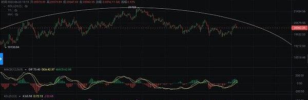 BTC日線級別,KDJ向上發散,MACD低位快線將要上穿慢線,K線走震蕩,MA5將要上穿MA10形成金叉,上方壓力21800附近23000附近。