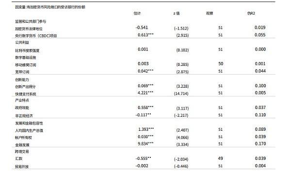 ?些驅動因素通過報告銀行促進了對加密資產的參與。我們發現,公共部門積極參與央行數字貨幣項目、更高創新能力、更先進經濟以及更大金融包容性的指標與銀行承擔加密貨幣風險敞口的可能性密切相關。