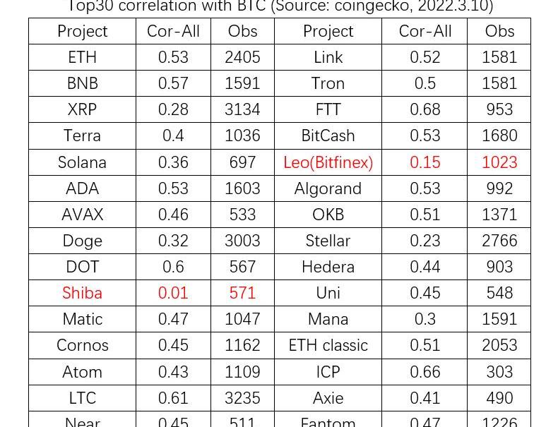 下圖選取了在2022年3月10日按流動市值排名的Top30項目。從有數據統計的時間開始,以它們每天的漲跌幅比例和BTC漲跌幅做相關性分析。結果表明,除了Shiba表現不出相關性,Leo和Stellar相關性較弱之外,其他27各項目都和BTC的漲跌成較強相關。