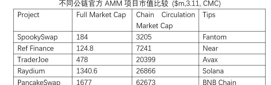 要考察周邊強大節點價值的影響,依然可以使用各個生態中的AMM項目市值來比較。不過出于對聯結緊密程度的控制,這里選取不同公鏈生態中的官方項目以及公鏈的市值進行比較。