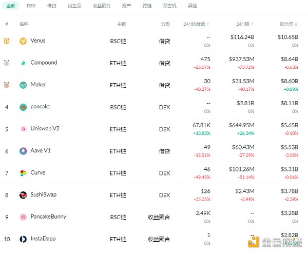 DeFi項目鎖定資產前十排名及鎖倉量,數據來源:Debank