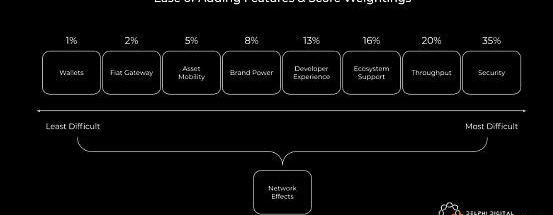 **PS:**這些評分因素之間并不都具有可比性,并非所有的因素都同樣重要,有些因素改進起來要更難。例如,對于一個解決方案來說,增加他們支持的錢包比突然提供更好的安全性和更大的吞吐量要容易得多。后者可能需要對設計架構進行徹底的修改和重建。考慮到這一點,我們開始對這些因素本身進行排名,以便我們可以使用權重來調整之前的分數。最終得到一個更加準確的評分表,如下所示。