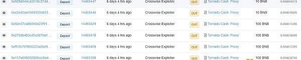 通過Tornado實現混幣,將盜取的BNB轉移到其他賬戶地址