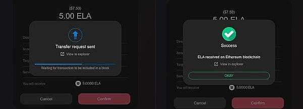 注意:轉移ELA和ETH,不需要授權。但是,對于ERC-20令牌,首先會有一個支出授權請求,以允許智能合約從令牌合約中檢索資金,然后是第二個請求,用于實際的網橋轉賬。