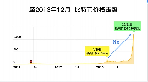 這個圖片是什么年份?這是2013年12月份比特幣價格到達1200美元。過去的高你會發現感覺可能買得很高,但是跌下來也很兇。但是下一個新高是好幾倍。所以從2013年初的4月份的牛市最高點兩百多美元,一直到2013年底的12月份1200多美元,有六倍。