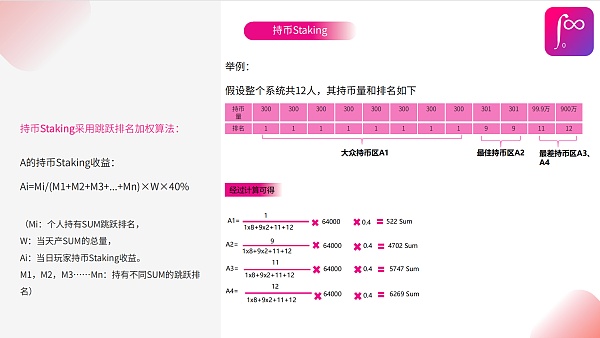 Sum每日釋放產出的分配比例分別用于:40%的持幣質押,40%的生態質押,20%的流動性挖礦,其中持幣質押是最為有特色的,相比起常態的Staking機制,都是只會按照用戶持幣加權計算,這樣的Staking機制造成的結果就是完全脫離公平公正的本質,而SumSwap采用獨特跳躍排名加權算法。跳躍排名加權算法的設計可有效打破資本壟斷的壁壘,顧及普通用戶,充分保障玩法的公平公正!