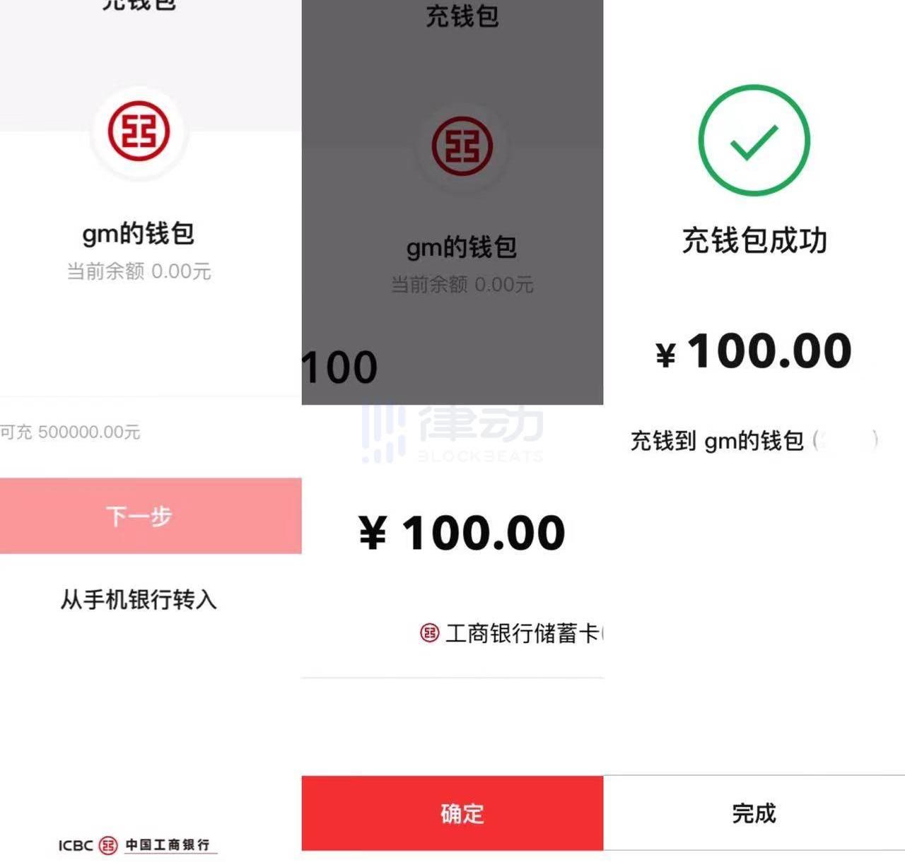 然后,律動BlockBeats試測向該錢包中轉入了100元人民幣,可分為兩種方式轉入,一種是通過儲蓄卡直接轉入,另一種則是打開手機銀行的App轉入。