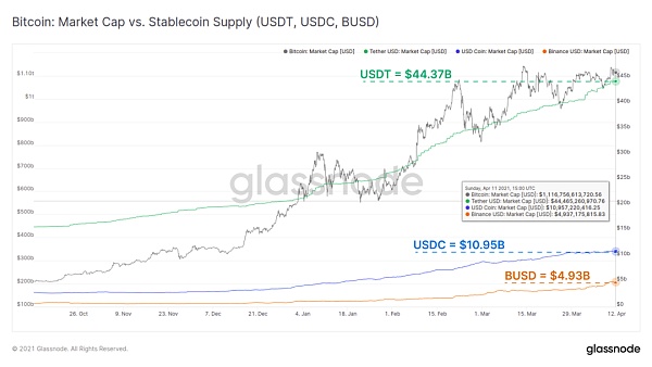 下圖展示了這些頂級穩定幣的供應增長與比特幣市值,顯示了這兩種資產需求的相關增長。僅USDT的供應量在過去兩周就增加了33.6億美元,即使BTC價格橫盤交易。