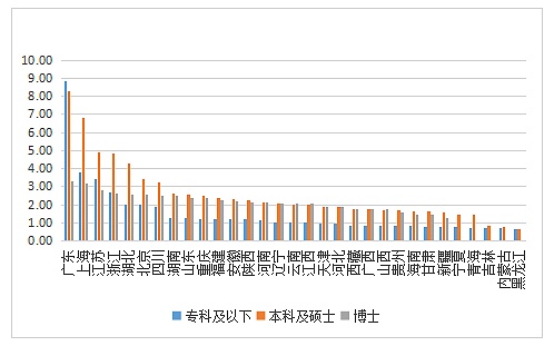 從分學歷的綜合指數看,專科及以下、本科及碩士學歷層次,廣東、上海、江蘇、北京、浙江、四川、湖北依舊保持綜合指數排行前七,但博士層次,江西、陜西、河南、湖南、天津綜合指數躍升前列,表明這些區域相比于前述省份更需求高學歷人才。