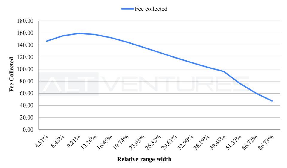 當價格區間更寬時,則不需要頻繁地進行調整。另一方面,較窄的價格區間得到更多的交易費用收入,但重置的成本也會更高。