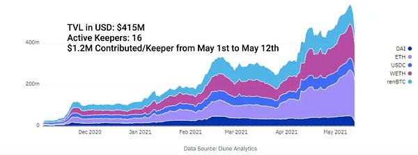 下圖顯示了Keeper從KeeperDAO流動性提供者那借入的閃電貸的累積價值。