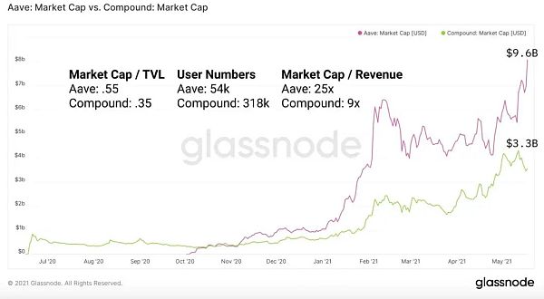 市值/TVL通常用作衡量項目吸引多少流動性的估值指標,這個指標與傳統市場中的市盈率類似,在傳統市場中,市盈率越高,每美元流動性的代幣估值就越高。在用戶數量和市值/收入比這兩個指標方面,Aave估值的情況類似。