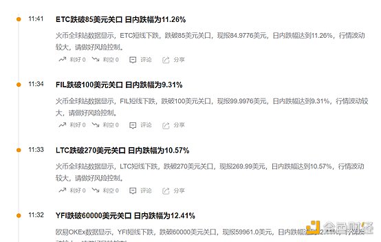 XRP/HKD+0.58%金色財經數據顯示,BTC短線下跌,跌破43500美元關口,ETH跌破3400。加密市場全線瀑布。