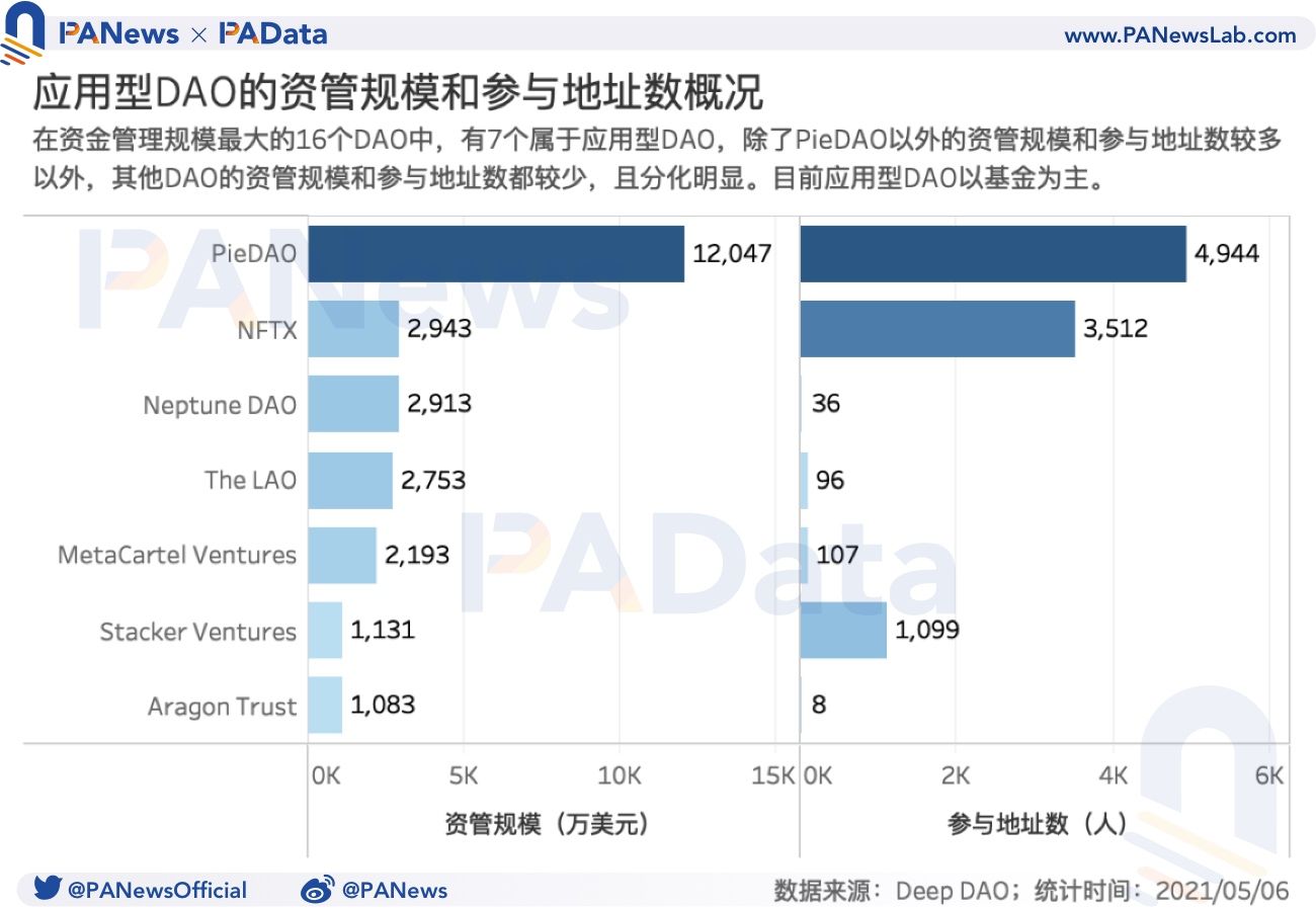 不過,就目前的情況而言,應用型DAO的資金規模仍然不大。在資金規模最大的16個DAO中,有7個屬于應用型DAO。其中,除了PieDAO內的資金超過了1.20億美元以外,其余6個DAO的資金規模都在1000萬美元至3000萬美元之間。而且認繳資金的地址數(參與人數)也不多,且分化嚴重。僅PieDAO、NFTX和Stacker Ventures的參與地址數超過1000個,最多的PieDao也僅不到5000個,其余4個DAO的參與地址數都在150個以下,最少的僅有8個。當前,資金規模較大的應用型DAO尚且不足以形成規模效應,資金規模較小的應用型DAO可能更難以形成。