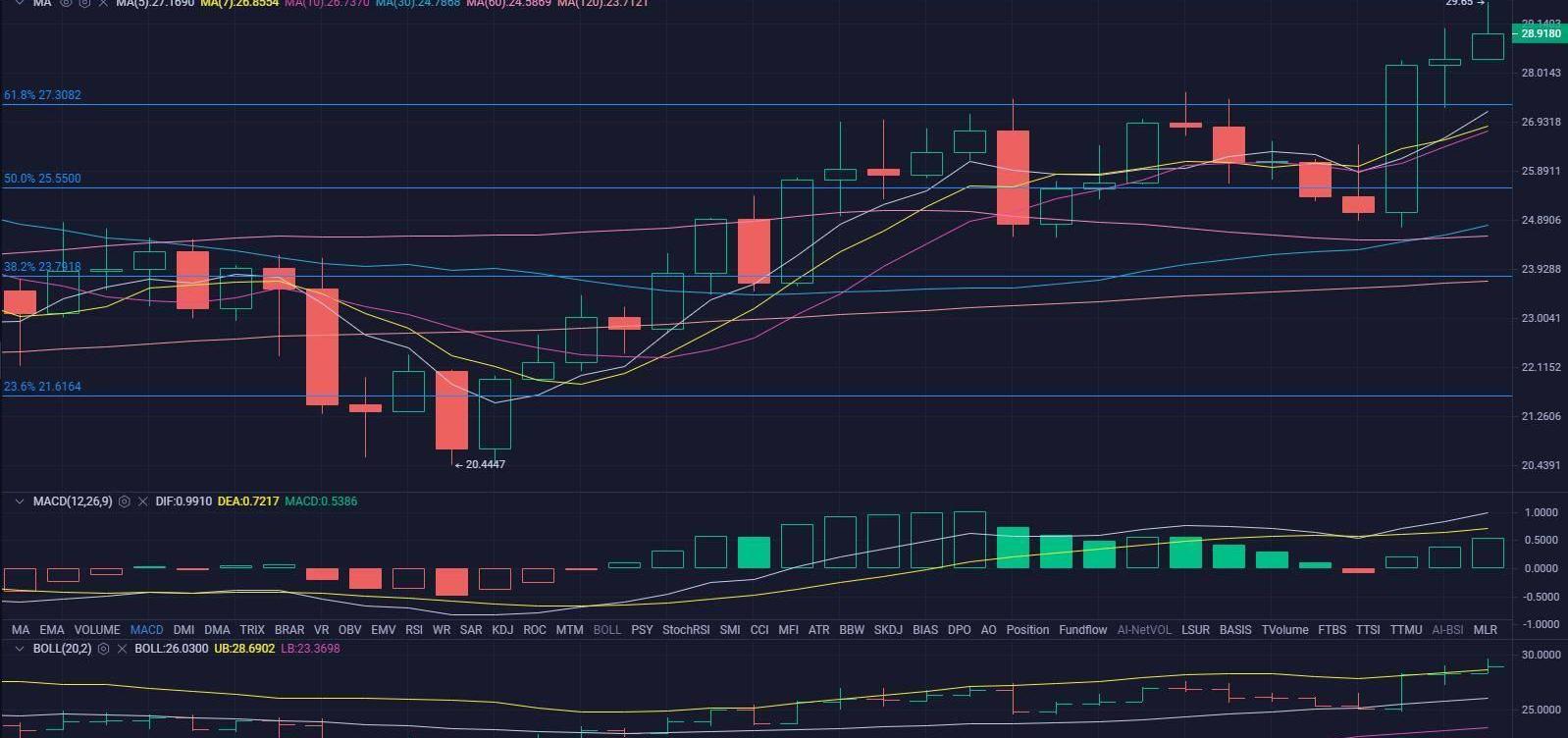 LINK淵哥還是繼續看好,下跌過程中的反彈比較有力,指標也相對強勢,長期來看接下來應該還會有不錯的表現。壓力位:31.5美元,支撐位:28美元。操作建議:中長線拿好。