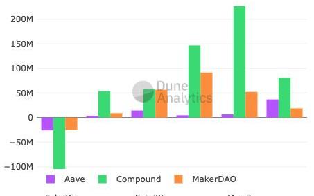 Aave、Compound和MakerDAO的凈借款指標,來源DuneAnalytics