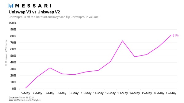 上圖:截至5月16日,Uniswap V3 的交易量占 V2 交易量的百分比增長趨勢。圖源:Messari & Dune Analytics