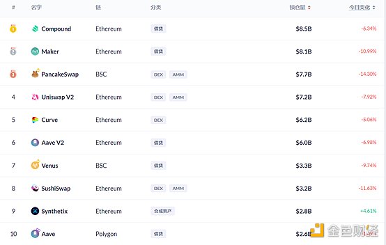 DeFi項目鎖定資產前十排名及鎖倉量,數據來源:Debank