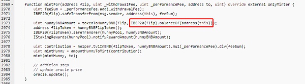 需要注意的是,mintFor函數用于將收取的手續費轉化為HunnyToken并返還給用戶;但在讀取需要轉換的手續費時,錯誤地使用了balanceOf做為參數,且在兌換HunnyToken時,使用的是固定兌換比例(當時為1 BNB:3200 HunnyToken),這給了黑客發動攻擊的可乘之機。