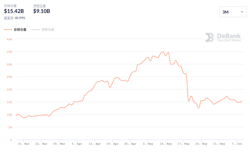 數據顯示,BSC 的 TVL 歷史最高點為 5 月 9 日的 348.1 億美元,當前(6 月 10 日) TVL 數據為 154.2 億美元,下滑幅度為?55.7%。?