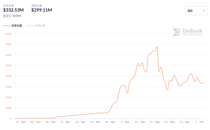 從趨勢來看,Fantom 生態 TVL 增長趨勢的拐點恰好是 5 月 19 日,可以說是直接遭遇了 519 事件的當頭一擊。數據顯示,Fantom 的 TVL 歷史最高點為 5 月 18 日的 6.76 億美元,當前(6 月 10 日) TVL 數據為 3.32 億美元,下滑幅度為?50.9%。