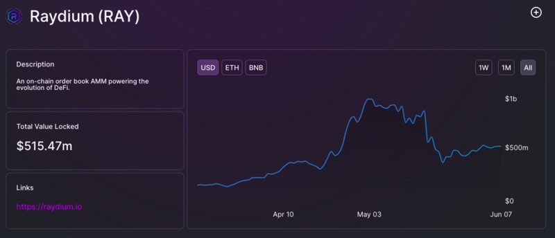 Solana 生態內的龍頭 DeFi 也不難猜——Raydium。Defi Llama 數據顯示,Raydium 當前的鎖倉量為 5.15 億美元,雖然也占據了整條 Solana 生態?TVL 的過半比例,但較 5 月 3 日的歷史高點 9.6 億美元已近乎腰斬。