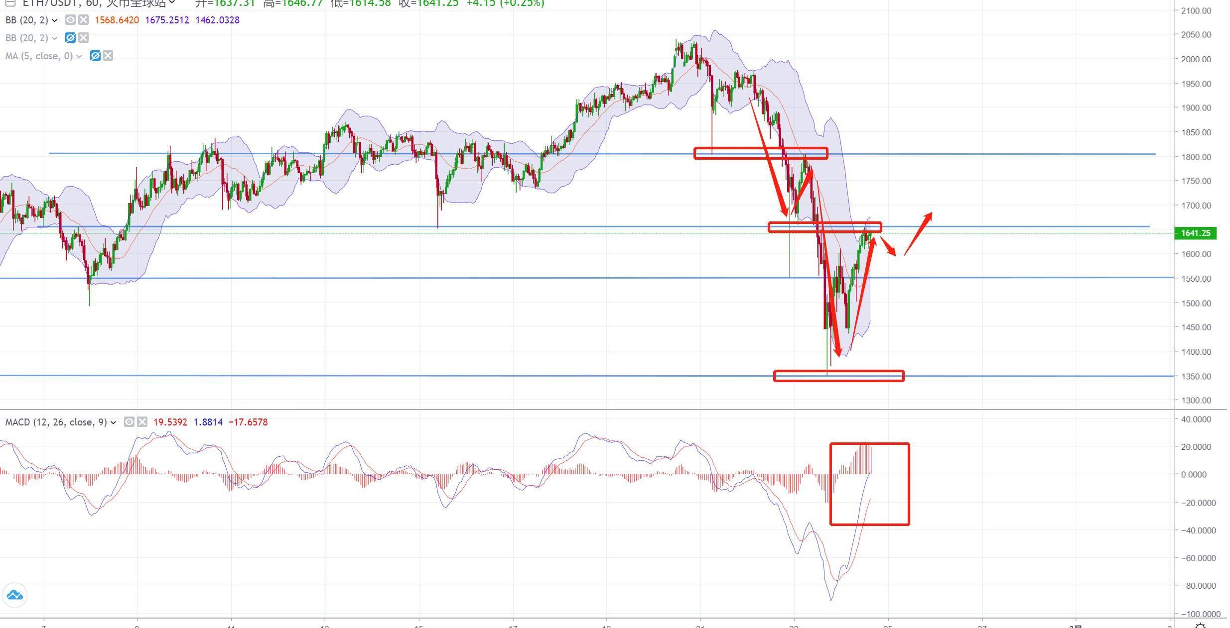 對于以太坊的行情,也同比特幣是比較類似的,行情也是經歷了兩次大幅的回踩,并且現在短線上在1350附近有筑底的跡象,這也是昨天天王在跟一個幣友交流的時候說,這一波,我看來以太坊的回調已經到位了。目前以太坊的環境,從日線來看,需要重點關注的就是前期的頂底轉換點1645位置,當前行情也是運行在這一區域,我們需要重點關注。周線上以太坊的走勢個人看來仍然會延續在布林中軌和上軌之間進行運行的,雖然目前日線的走勢偏弱,但是大體的漲勢并不影響的,所以從我個人來講,我是更偏向于回調繼續做多的,控制好倉位以及進場點位就可以了。就算進場點位沒有選擇好,也可以選擇鎖倉進行交易,也是問題不大的。新低附近1350這一個位置直接給到就可以去選擇進場,多單止損帶好,利潤是止損的兩倍以上就可以了。如果行情意外進行破位,那么我們下一個埋伏點位也可以放在1275附近,這個位置的利潤就可以是上一單利潤的兩倍以上。其實我個人是比較看好行情這一波上漲會漲穿1645位置的,如果說你也和我一樣是一個看多者的話,那么你的單子多單利潤可以拿到1780附近,再次考慮減倉,為什么這么說呢?從均線上來看可能會更加明了一些,日線是到60日均線附近開始反彈上行,那么行情不論盤中空頭是多么強勢,都不太可能隨便地跌破60均線,那么我們圍繞日線的60日均線這個位置就可以去嘗試著做多。