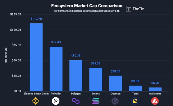 以太坊多年來一直是智能合約平臺的市場領導者,因此以太坊生態系統的市值為7946億美元也就不足為奇了,這比第二大生態系統幣安智能鏈(BSC)多出600%。但由于以太坊高昂的GAS費,使得新用戶不得不尋求其他方法,許多人已經開始探索替代鏈。除以太坊外,目前有三個智能合約平臺的全生態系統市值超過500億美元:BSC(1107億美元)、Polkadot(724億美元)和Polygon(503億美元)。目前Solana的市值為380億美元。