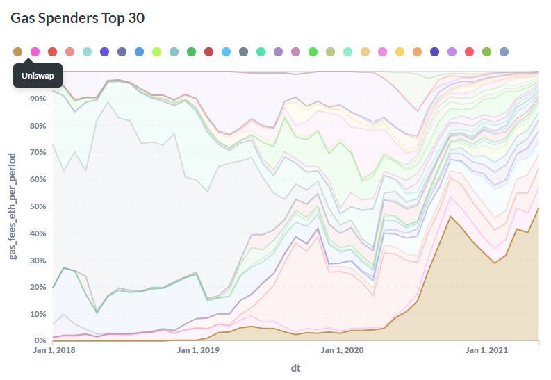 下面這張圖更有趣,其中展示了自 2018 年至今,排名前三十的實體所花費的 gas 相對比例,數據來源 Metabase。