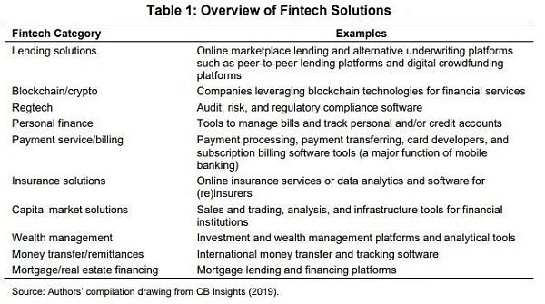金融科技或數字金融是一種商業方法,致力于通過互聯網相關技術使金融服務。通常情況下,金融科技公司在金融領域扮演兩個角色。一個是作為傳統金融機構的挑戰者。在這種情況下,這些金融科技公司依靠算法或基于機器的邏輯來復制傳統金融機構的后臺流程,并產生新的基于技術的商業模式。另一個是作為先驅者,在沒有傳統金融基礎設施的地方提供服務。例如,通過移動銀行和其他基于互聯網的自動信息平臺提供服務。金融技術包括不同的應用,包括借貸、區塊鏈/加密貨幣、監管技術、個人金融、支付服務/賬單、保險、資本市場 解決方案、財富管理、資金轉移/匯款和抵押/房地產融資(表1)。