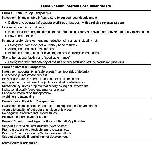 我們提出一個全面的基于區塊鏈的方法,整合了多種金融技術應用,為可持續基礎設施投資調動國內融資、投資。該方法應考慮到各利益相關者的利益 包括當地居民、公共政策、多個投資者及國際發展機構。表2概述了這些利益相關者的可能利益。