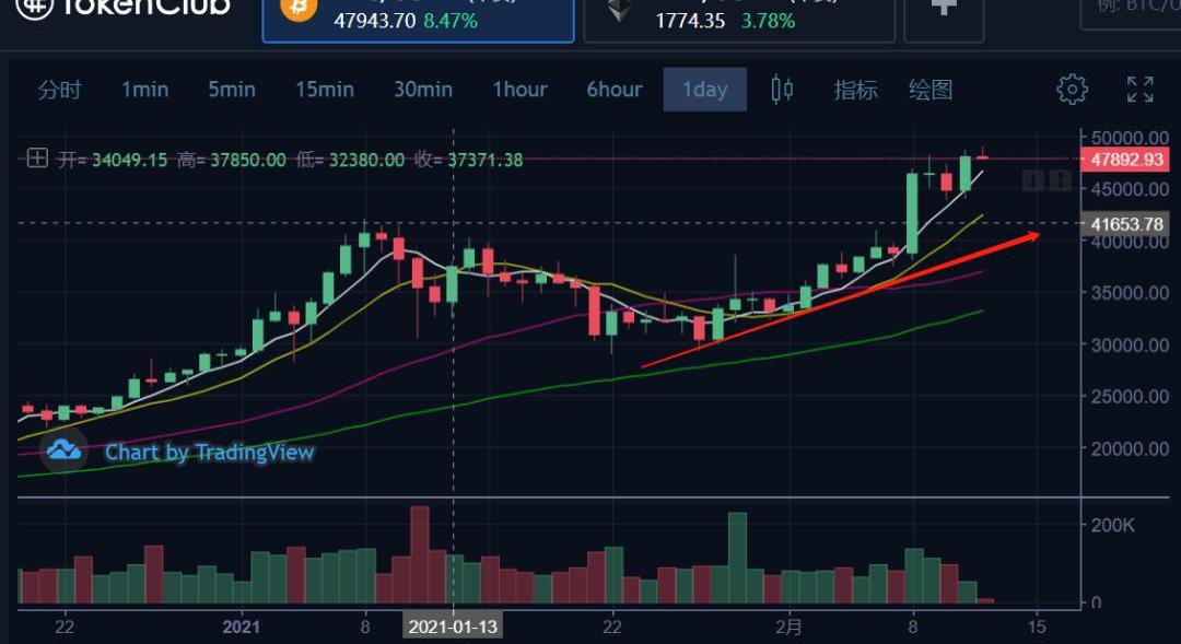 除夕佳節,雨神在圈子里給大家發紅包,在發布上漲信號后,市場立刻上揚,從45000漲到接近49000,打開4000美金漲幅空間。