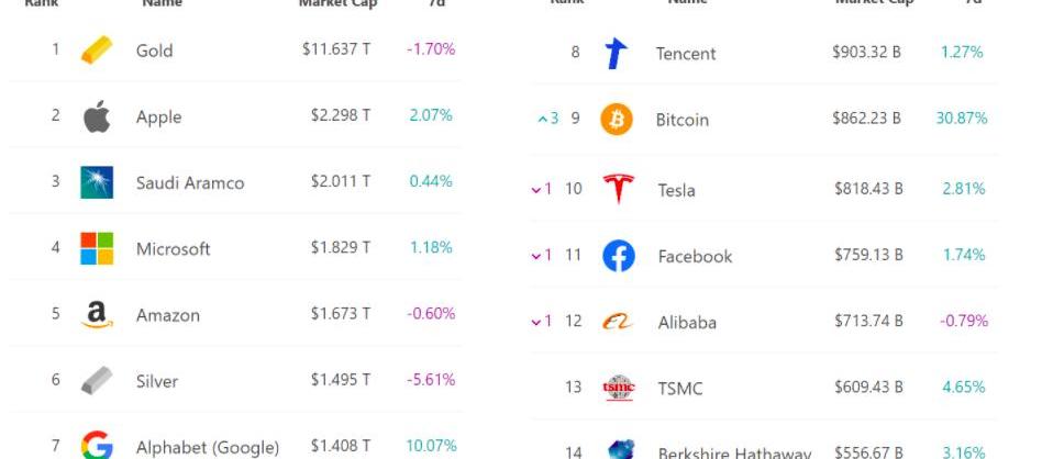 公司、加密貨幣和金屬市值排名?來源:8marketcap.com