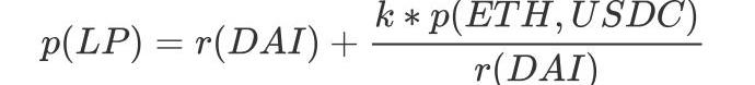 這個公式是怎么來的呢?實際上這個公式依然基于WarpFinance所采用的公式,但是AlphaFinanceLab認為不能使用ETH-DAI池中的r值,應該使用一個所謂公允的值r`。假定ETH-USDC和DAI-USDC中的價格都是公允的,那么