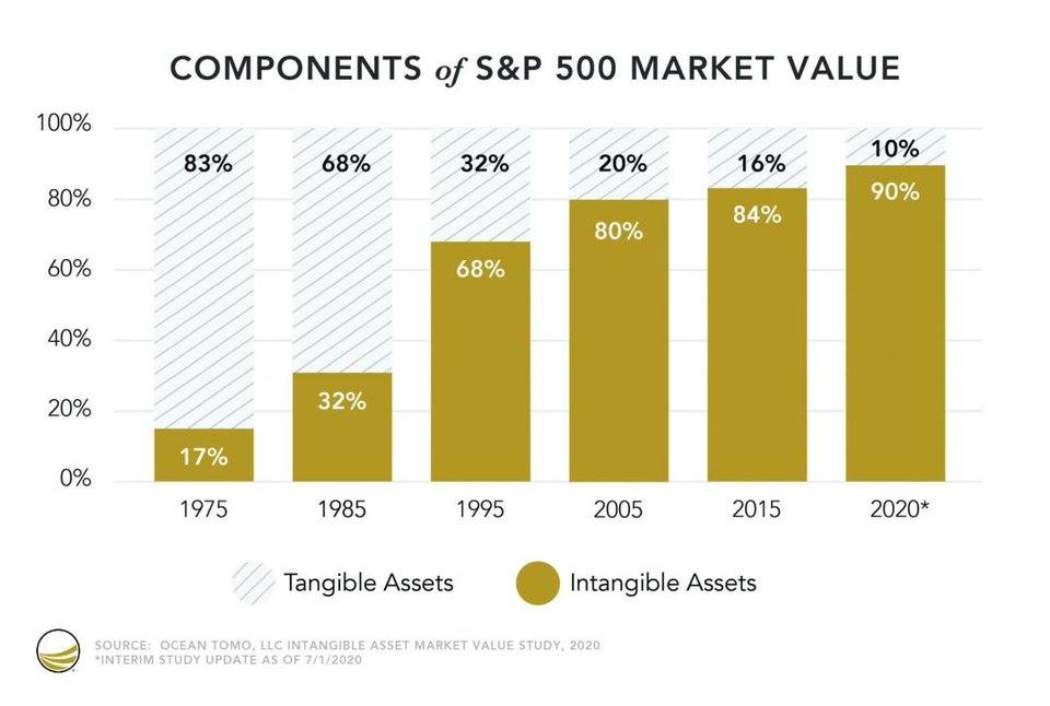 在 20 世紀 90 年代之前,最有價值的資產(按標準普爾 500 指數的成分分類)是有形資產。制造業、設備和房地產是公司資產負債表上更有價值的資產。隨著互聯網的出現和美國向服務型經濟的轉型,無形資產的估值發生了轉變。