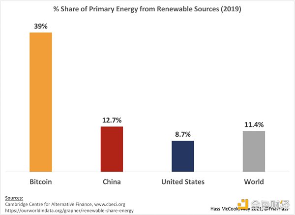 2.?根據劍橋新興金融研究中心的數據,76%的礦工有使用可再生能源,可再生能源在能源結構中占比約為29%至39%,世界上最大的礦工和礦池CoinShares估計總可再生能源總占比甚至可能高達73%。