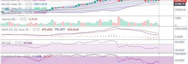 日線圖中,其K線已經接連兩日收陽,第一日收陽漲幅并不是很大,就連震蕩幅度都是受限的;而昨日的向上拉升打破了原有的震蕩區間,沖破上方的阻力,到其高位34851點位;今日行情出現大幅回落,重新試探下方的支撐力度,最終以低位31906點位收回;這波回調是由于利空消息頻頻爆出而造成連鎖效應,隨著時間的推移行情便會逐漸回升。