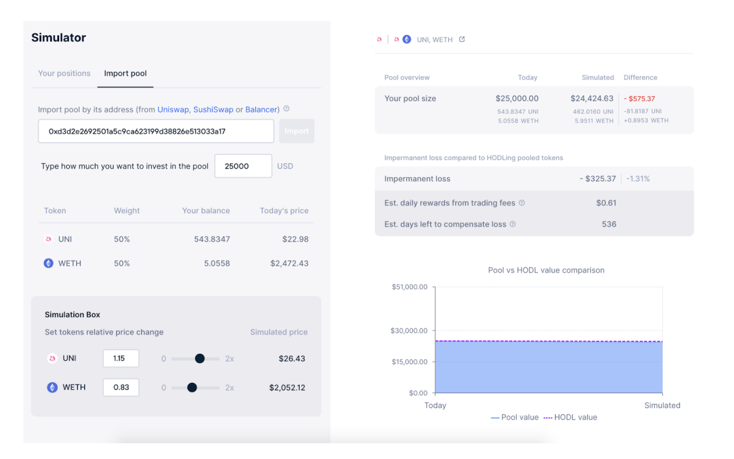 需要注意是,在以下模擬中,1.15 倍的UNI和0.83倍的ETH會導致1.31%的頭寸因無常損失而造成損失。該模擬顯示了收回此費用值所需的天數。回收這個損失的另一種方式是,價格恢復到原來的價值,因此是“非永久性”。
