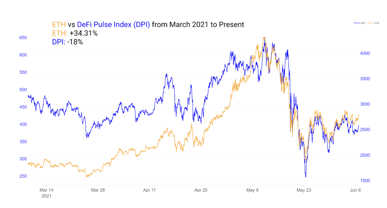 首先使用DeFi Pulse Index(DPI)來衡量購買和持有ETH與購買和持有DeFi治理代幣的對比。可以看到,對回報的簡單比較表明,DeFi治理代幣在今年的大多數時間段內表現明顯低于ETH。從3月份開始,DPI對ETH的回報最差,下降了18%,而ETH在同一時期增長了30%。自2021年開始,DPI上漲2.8倍,ETH上漲3.6倍。