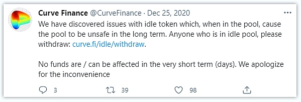 安全性:與所有的 DeFi 協議一樣,Curve 在其自己的協議和其網絡中集成的所有協議中都面臨著智能合約風險。雖然 Curve 的智能合約由 Trail of Bits 審計,但安全審計并不能完全消除風險。比如,2020 年 12 月,Curve 發現了 Idle 代幣的問題,這導致了 Idle 池從長遠來看是不安全的,見下圖。